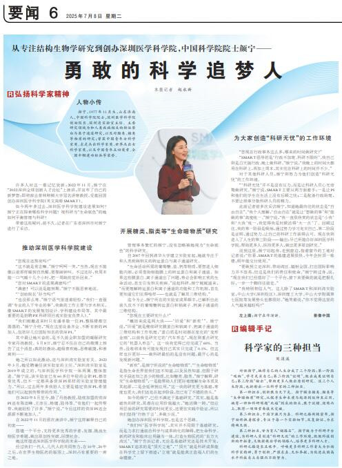 “我们叫‘医学科学院’,其实并不局限于基础研究,而是力求打通前沿科学与成果转化的障碍,把生命科学、新药研发和临床应用融为一体,打造生物医药的‘东方大湾区’。”颜宁告诉记者,无论是基础研究还是技术开发,SMART追求的是“顶天立地”,“‘顶天’就是科研成果能在科学史上留下痕迹;‘立地’就是能真正造福人们的生命健康。”